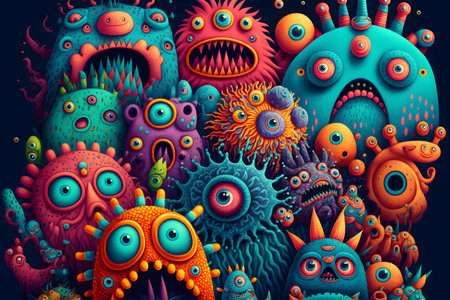 Surreal colorful fluffy creatures monsters, many toothy and big-eyed colored creatures, creepy bacteria microbes, illustration