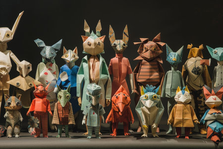 Collection of various origami animals standing next to each other, A multitude of origami characters, each one a work of art in its own right