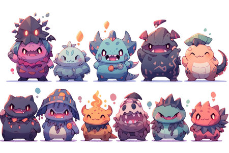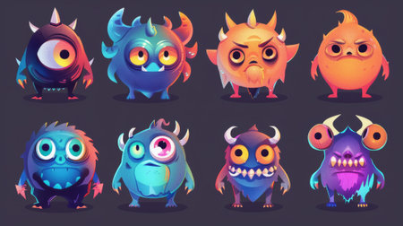 Colorful cute monsters with friendly expressions showcasing varied shapes and textures