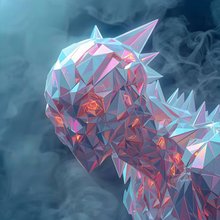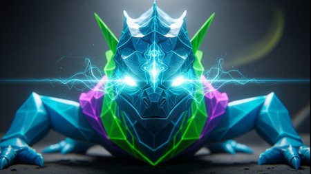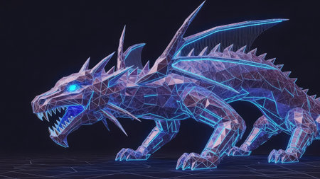 A digital illustration showcases a dragon rendered in a geometric style with a glowing blue outline. The creature has detailed wings and sharp claws. The artwork employs a low-poly aesthetic, with vibrant lighting. It might be suitable for fantasy art, game design, and conceptual design use.