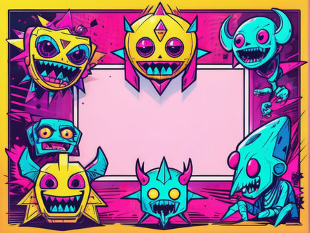 Exuberant Alien Artwork A Vibrant Collection of Cheerful Aliens in Exaggerated Sharp Teeth Arranged Around a Pink Frame with Purple Borders