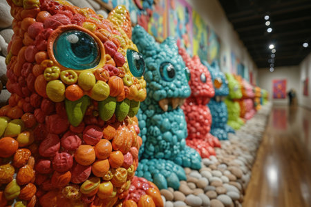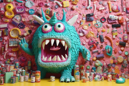 The monster on the wall is covered with candy, in the style of pop culture collages, organic sculptures, kombuchapunk, green and amber, vibrant, catcore, caninecore. Generative AI image weber.