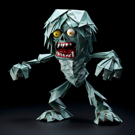 a black background sets the stage for an intense and dynamic origami zombiewoodworking paper model. this dark fantasy creature is depicted in a colored cartoon style, with a light aquamarine hue adding a touch of intrigue. the gritty textures add depth to the image, captured beautifully with the zeiss milvus 25mm f/1.4 lens. ai generated
