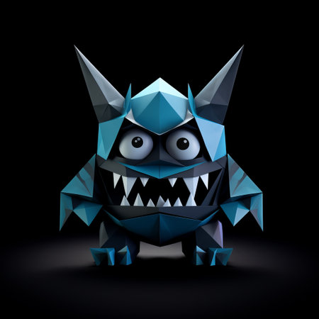 a blue monster with teeth is depicted in this 3d photo render. the design draws inspiration from bold geometric minimalism, reminiscent of akihiko yoshida's style. the black background enhances the cute and cartoonish features of the monster. the use of paper adds a unique texture, while the monochromatic color scheme and gemstone details add an extra touch of visual interest. ai generated