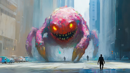 A giant, squishy monster with glowing eyes looms over an urban landscape, creating a whimsical and dramatic scene that blends fantasy and reality.