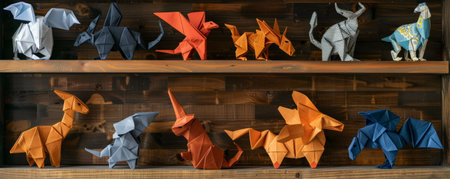 Overhead top down view of a collection of different origami animals displayed on a wooden shelf. Each origami piece is intricately folded and colored, showing the skill and creativity of the artist.