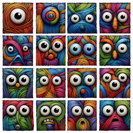 Colorful cartoon monsters in various shapes, expressions on vibrant background.