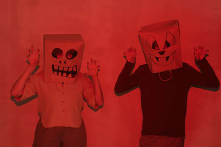 Young people in paper bags with funny grimaces on heads gesturing hands while scaring you in darkness, red light effect