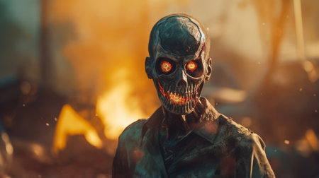 a halloween-themed photo captured with a nikon d750, showcasing a vividly rendered scene from the video gameplay of fallout 4. the image features burned and charred slayers and zombies, with a skeletal appearance made of liquid metal. this ultimate zombie survival gameplay 2 is presented in a cinematic style using cinema4d. ai generated