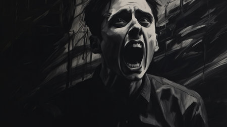 a performance art piece featuring a creepy frustration painting in black and white. the artwork showcases a michael shouting, surrounded by shadows on the wall. the piece evokes a profound sense of loneliness and is reminiscent of a realistic pencil sketch on paper. ai generated