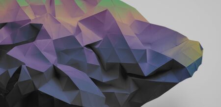 Abstract 3d rendering of chaotic low poly shape. Multicolor glowing background.