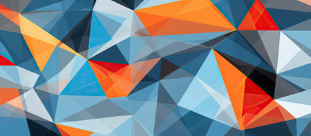The composition features a dynamic arrangement of triangular shapes in varying shades of blue, orange, and gray, creating a captivating abstract texture that suggests depth and movement.