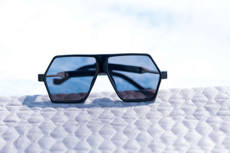 Black Oversized sunglasses shoot in a summer day closeup. Selective focus