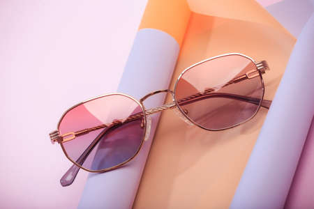 Fashion showcase with stylish sunglasses and geometric shapes on blue-pink pastel background. concept art