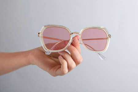 Woman holding stylish sunglasses on light gray background, closeup of hand