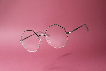 trendy eye glasses on green geometric pink podiums, colorful background, copy space