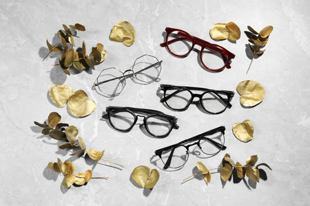 Many glasses in stylish frames and leaves on gray marble table, flat lay