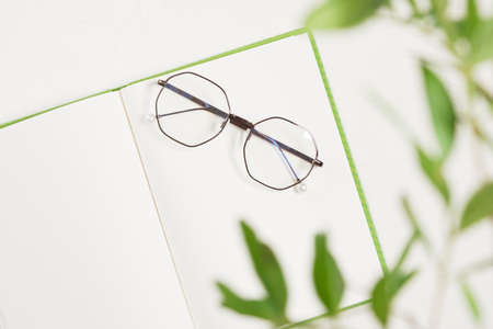 trendy modern glasses notepad and branch with small green leaves on light background copy space, summer and spring mood concept top view