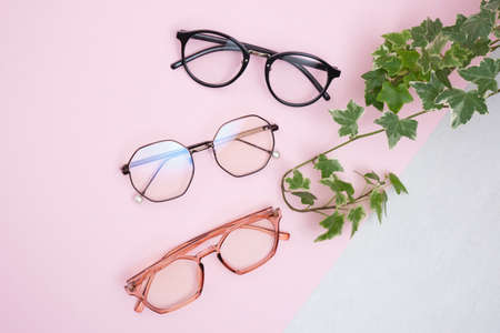 multiple trendy stylish eyes glasses on pink and gray background copy space flower indoor with green leaves top view