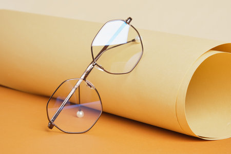 trendy eye glasses on rolled beige paper, geometric background, trending colors, yellow background copy space