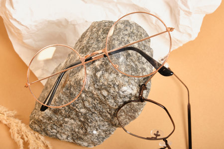 two stylish glasses on a stone on a background of crumpled white paper, trendy accessories for vision correction beige background