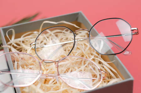 Stylish women's glasses in a gift box. Gift or sale of stylish optical glasses.