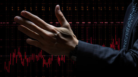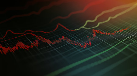 Close-up of stock market data displayed on a digital interface, featuring red trend lines and charts. Ideal for finance and technology themes.