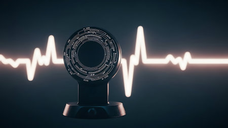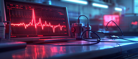 A close-up of a digital heart rate monitor displaying a heartbeat waveform, vibrant green lines against a dark background, illustrating medical technology