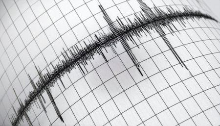 Seismograph paper with a bold earthquake wave line showing seismic activity.