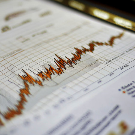 A detailed view of a financial chart showcasing rising and falling stock market trends with red lines illustrating recent price fluctuations on grid paper.