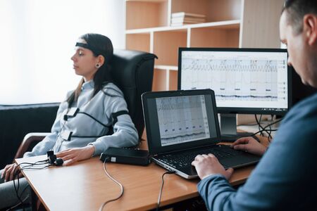 Reality has limitations, imagination - not. Girl passes lie detector in the office. Asking questions. Polygraph test.