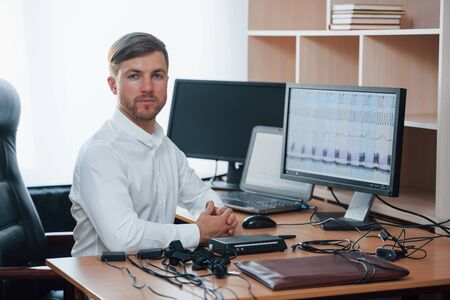 White shirt and many of devices. Polygraph examiner works in the office with his lie detectors equipment.