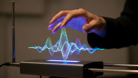 Hand playing a theremin with colorful, glowing sound waves emanating from it. Clear details and v...