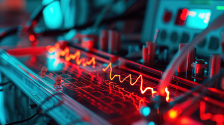 This abstract illustration features a glowing waveform on a dark background. It symbolizes health, technology, and energy, perfect for digital projects.