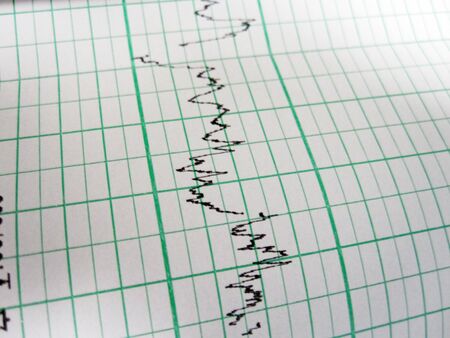 Seismological device for measuring earthquakes. Seismological activity live on the sheet of measuring paper. Earthquake wave on graph paper.