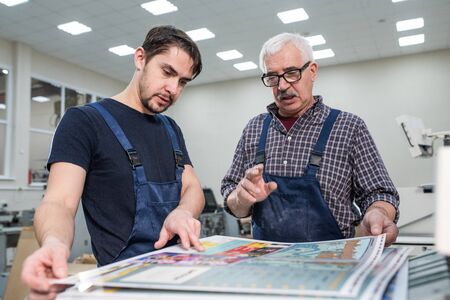 Experienced senior worker in glasses explaining young man how to estimate print quality during his internship