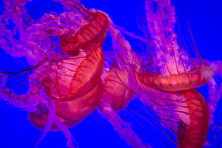 Beautiful jellyfish or medusa in the neon light in aquarium in new opened Prague medusarium in Czech Republic