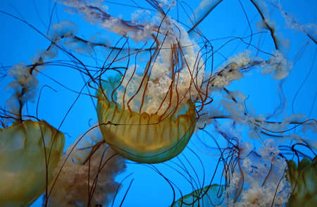 Abstract underwater image of long tentacles of colorful poisonous jelly fishes in deep sea water