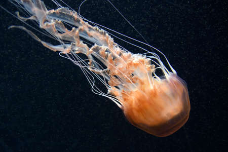 A translucent orange jellyfish with long, trailing tentacles glides gracefully through a dark aquatic environment