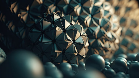 This composition showcases a series of interlocking geometric forms that display a captivating metallic texture. The intricate shapes catch ambient light, creating a dynamic interplay of reflections and shadows. The overall effect evokes a sense of depth and dimension, drawing the viewer into a visually stimulating arrangement.