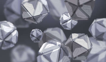 Abstract 3d rendering of chaotic low poly particles. Flying polygonal spheres in empty space. Futuristic background with bokeh effect. Poster design.