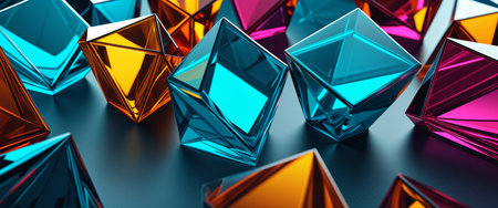 A vibrant geometric pattern with multicolored glass cubes, forming a kaleidoscopic design on a dark backdrop, with each cube reflecting different hues and creating a dynamic visual.