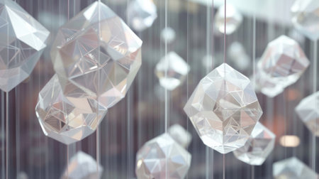 3D geometric shapes with reflective surfaces create a captivating play of light and texture against a blurred backdrop.