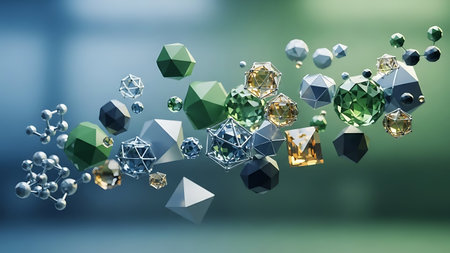 A collection of reflective 3D geometric shapes and molecular models suspended in a vibrant teal gradient backdrop, ideal for science, technology, and modern design concepts.