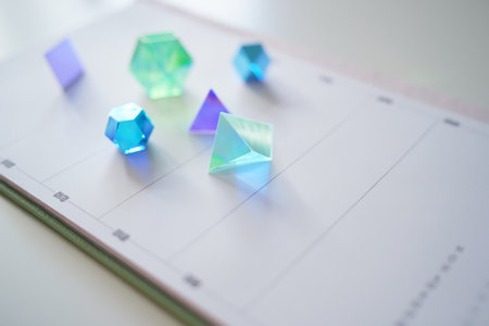 Close up of blue and green glass cubes on the calendar page.