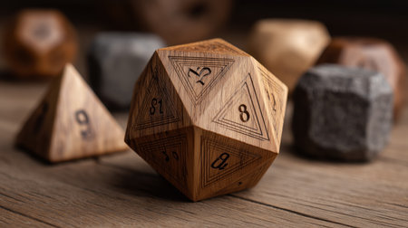 Wooden dice tabletop game roleplaying polygon number closeup rustic oak gaming dice with engraved numbers wooden table