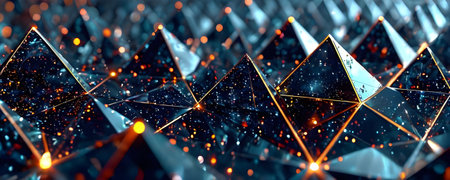 Abstract background with floating glass or crystal triangular prisms. Concept of technology, innovation, and future.