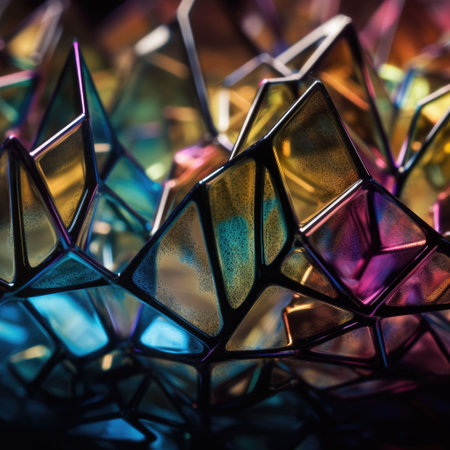 Fragmented geometric shards glowing with holographic light in bright colors
