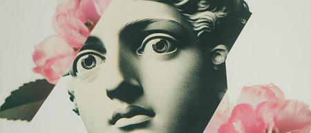 Minimalist collage featuring a statues face with flowers and geometric shapes