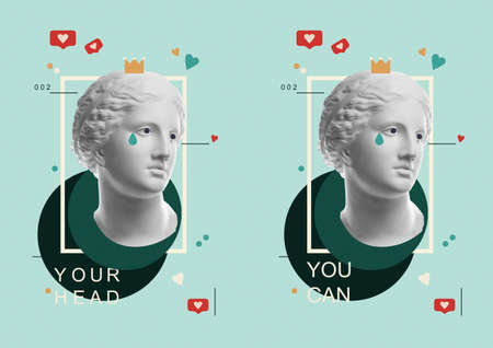 Fashion art collage with plaster antique sculpture of Venus face in a pop art style. Creative vogue concept image in contemporary surrealism style. Beauty, fashion and health theme. Zine culture.